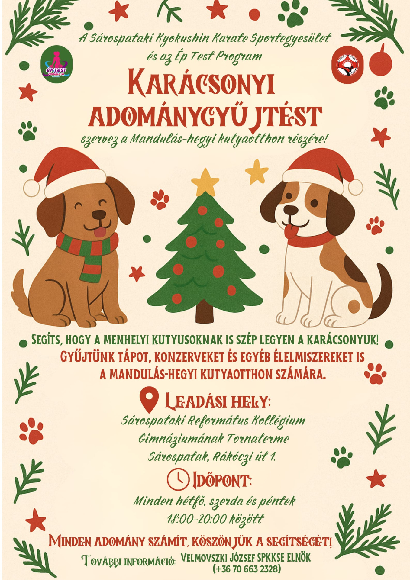 Már hagyomány hogy minden évben, így karácsony közeledtével a Sárospataki Kyokushin KSE és az ÉP Test Program tagjai meglepetéssel kedveskednek a rászorulóknak. Ebben a évben a Sárospataki a Pécsvárady Botond EGYMI kis tanulóinak jelentős mennyiségű tartós élelmiszert, valamint a Manduláshegyi Kutyaotthon négylábú lakóinak tápot és eledelt valamint anyagi támogatást tudtunk átadni. Nagyon büszke vagyok mind a két csapatomra, és ez úton szeretném minden támogató tagnak megköszönni hogy az ő segítségükkel évről évre átélhetjük az adakozás felemelő érzését. "Mert adni jó !"